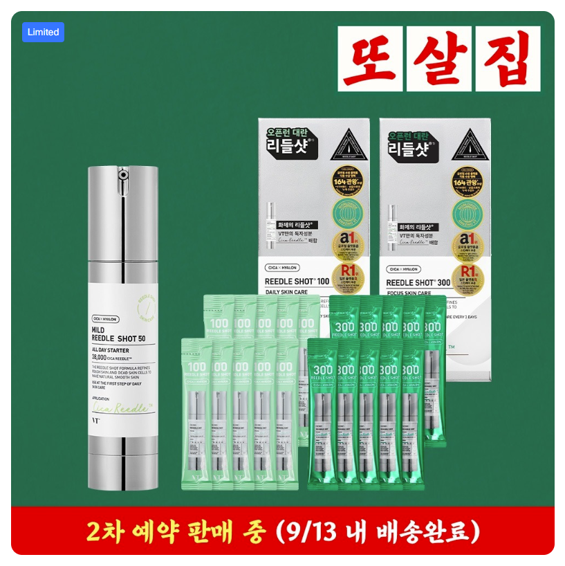 안녕하세요! 빈노트입니다:) 빈노트의 차곡차곡! 오늘도 채워나가 봅시다! 오늘의 주제는 또간집 X VT 리들샷 이벤트입니다:) 화제의 중심인 리들샷을 저렴하게 구매할 수 있는 판매가 열렸는데요! 함께 알아보시죠! 또간집 X 리들샷 2차 예약판매 *예약 판매 기간 : 7/10 (수) 14:00 ~ 7/19 (금) 23:59*예약 판매 배송 일정 : ~ 9/13(금)까지 배송 완료 예정 리들샷 구성VT 마일드 리들샷 50 (50ml) 리들샷 스틱 파우치 2ml*10개 (100 또는 300 중 택 1) 유통기간 마일드 리들샷 50 : 27년 2월 까지 또는 이후 리들샷 100 스틱 파우치 : 27년 6월 까지 또는 이후 전 지역 무료 배송제주 및 도서 산간 포함 방식 리들샷?리들샷은 바늘 모양의 미세침..